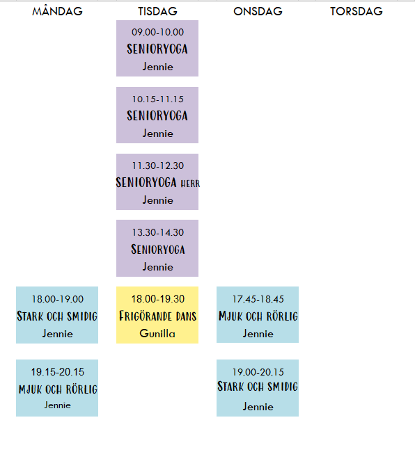 Varmt välkommen till en ny hösttermin på Jennies Yoga! Så här ser första kursomgångens schema ut.